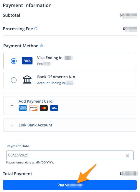 3. Select a payment method and click the blue Pay $--.-- button to complete your payment