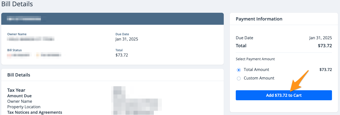 1. Select the bill you wish to pay and click Add $--.-- to Cart (see Partial Payments on MyHarrisCountyTax)